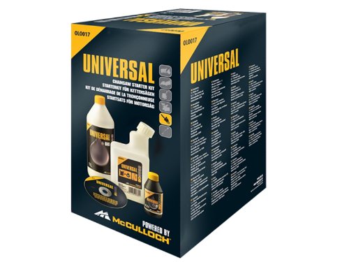Kit de démarrage pour tronçonneuses thermiques MC CULLOCH - composé de : 1L de mélange, 1L d'huile bio pour chaîne, 1 bouteille d'huile 2 Temps, et 1 DVD d